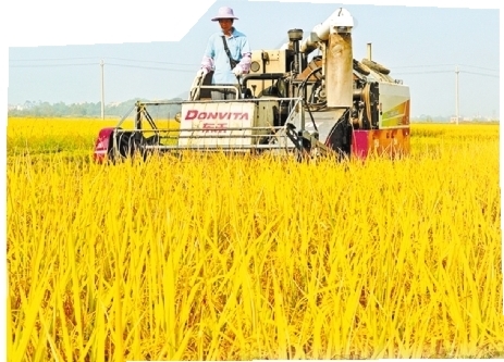 桂平市是广西最大的水稻生产基地之一,水稻种植面积达120多万亩,年产水稻50多万吨,农业机械化程度达90%以上。图为该市夏粮收割场景。