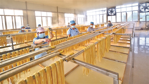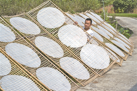 罗秀米粉素有“中国一绝”美誉,是桂平市农业传统特色产业之一。图为桂平市罗秀米粉加工作坊工人在晾晒米粉。