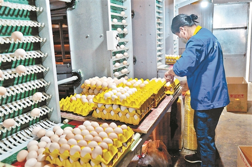 桂平市厚禄乡百万羽蛋鸡养殖基地里,工作人员正在拣鸡蛋。